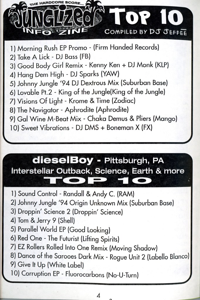 JEFFEE: Well, I took the money from when I had moved… I had a 401k, the thing where they save money for your retirement, and I bought a Macintosh with it. I said, “I’m going to make a magazine”, like a fanzine, because we keep hearing of all these artists across the country. I had heard of a guy out in New Mexico playing Breakbeat Jungle, a guy in Los Angeles, and a guy in Toronto called Ruffneck. He [Ruffneck] would play all these M-Beat records +45, all the way, as fast as possible… I really liked that stuff.