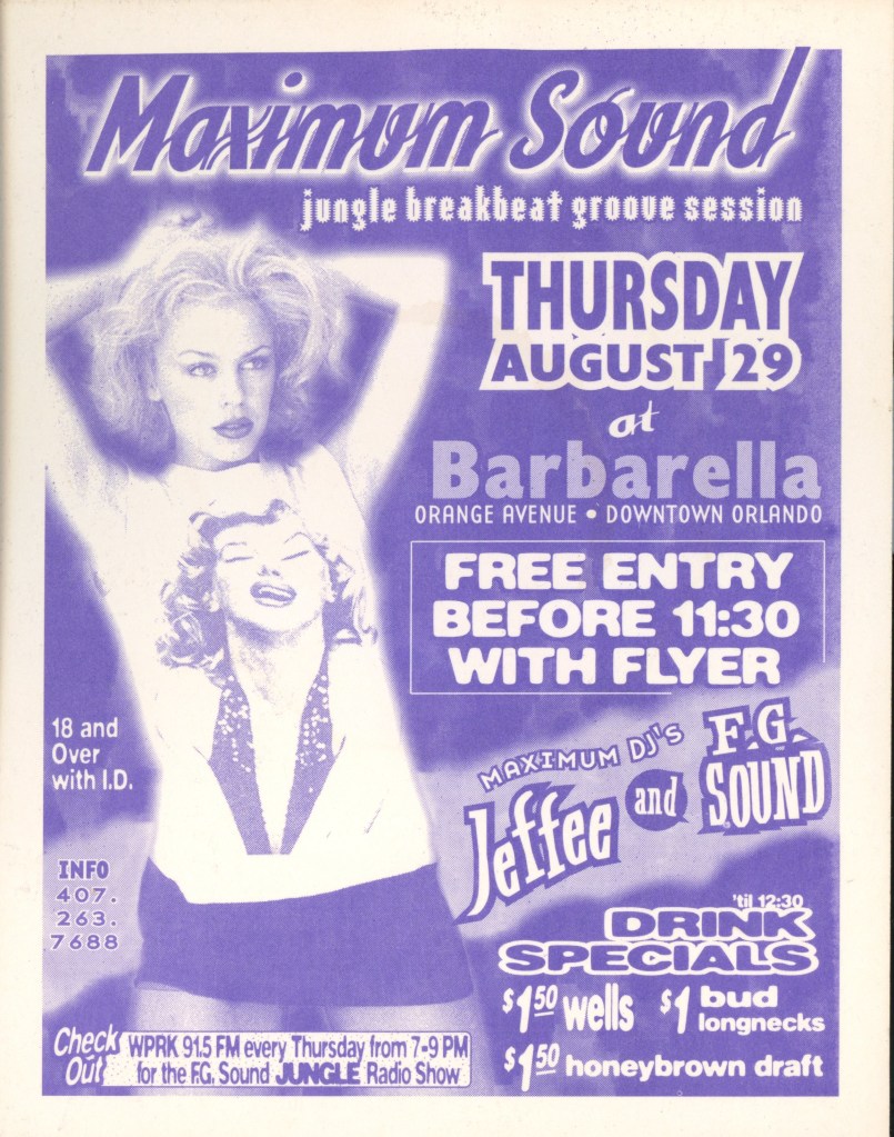 JEFFEE: Well, I had heard of this guy… Somebody I knew went on tour with the Prodigy, and he brought back a tape of this guy called AK1200 down in Florida. This guy scratches and stuff like that, but he’s playing the same things we are. I had never thought of moving to Orlando; this is ’93. And then, I moved to Orlando in ’94. When I moved down here, I thought because AK was here, it was a Jungle mecca of some kind… nope, it was breakbeat, but Florida breaks only go so fast, and then they stop. That early Rachel Wallace Suburban Base kind of speed, and they never went any faster.